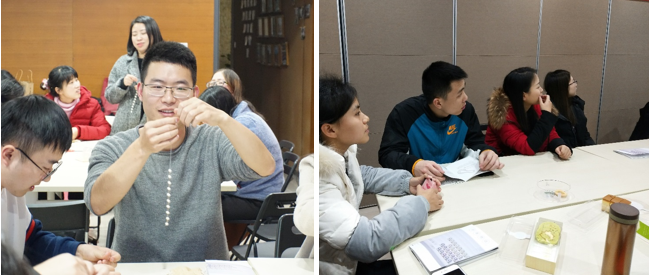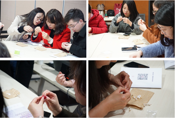 活動一經(jīng)推出,異?;鸨?,同事們紛紛積極踴躍的報(bào)名參加,僅短短幾天時(shí)間報(bào)名人數(shù)已超過70余人。工會委員會為了確保每位員工都可以真切的感受到DIY珍珠手鏈的樂趣,確保本次活動的質(zhì)量,將活動分為20和21號兩天。雖然已經(jīng)是下班時(shí)間,但是大家的熱情依舊高漲。瞧,大家都在認(rèn)認(rèn)真真的聽孫小姐分享珍珠文化。